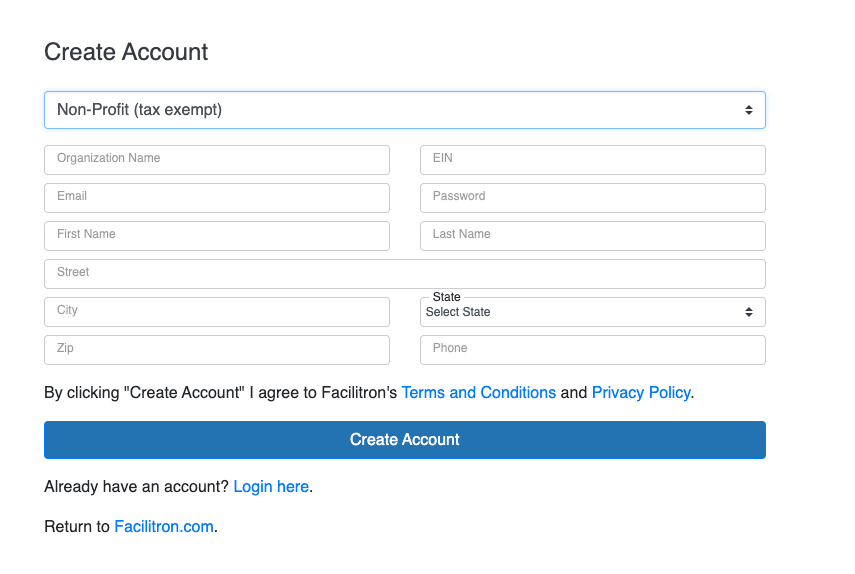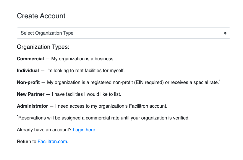 - Click "Sign Up" at Facilitron.com and select your account type - non-profit, commercial or individual.